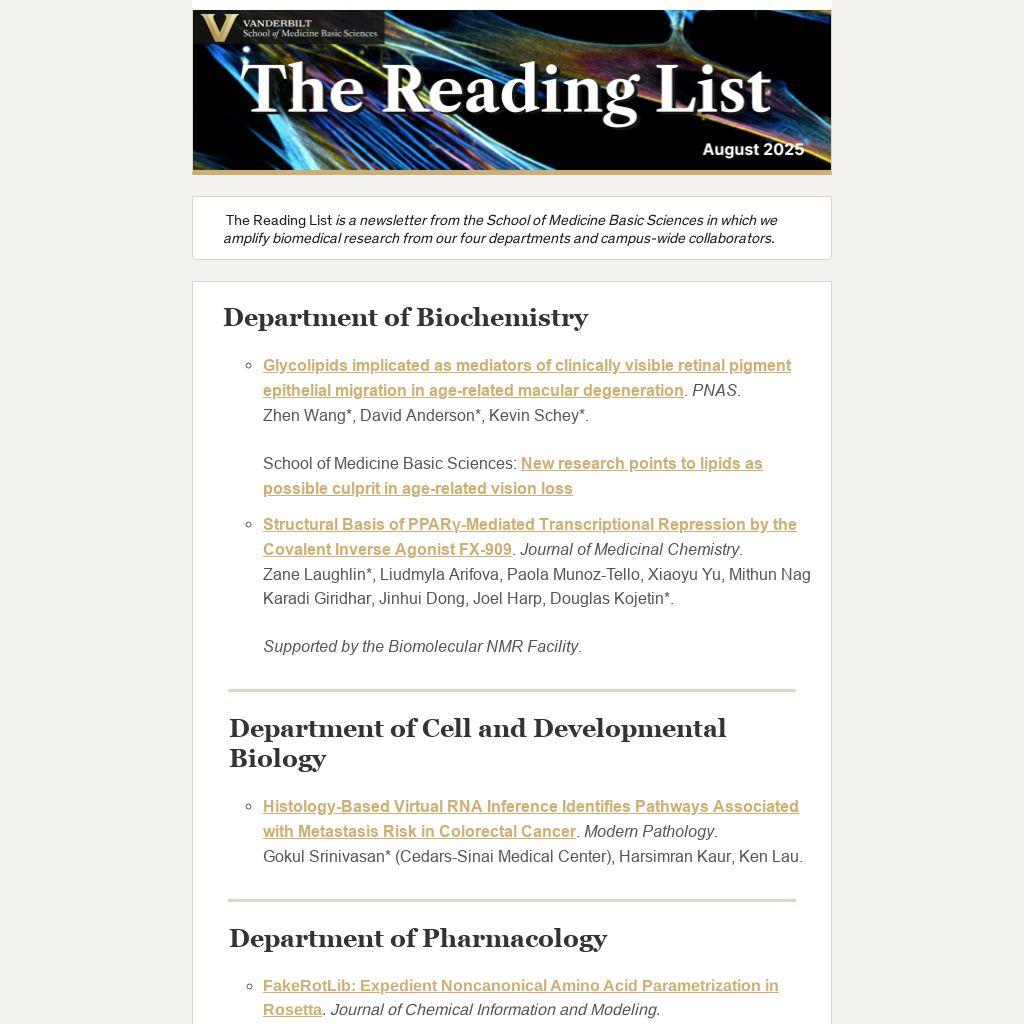 The Reading List is a newsletter from the School of Medicine Basic Sciences in which we amplify biomedical research from our four departments and campus-wide collaborators.