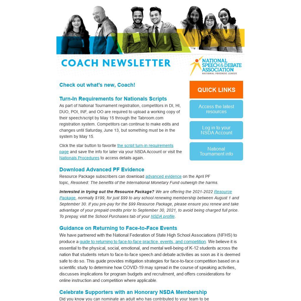 If you are eligible to participate in our resource survey, you would have received an email on April 12, from info@speechanddebate.org via SurveyMonkey with the subject line 2021 NSDA Resource Survey. Be sure to check your spam folder! We hope you'll take the time to participate and share your perspective.