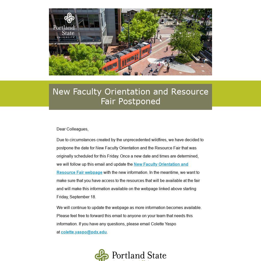 Due to circumstances created by the unprecedented wildfires, we have decided to postpone the date for New Faculty Orientation and the Resource Fair that was originally scheduled for this Friday. Once a new date and times are determined, we will follow up this email and update the New Faculty Orientation and Resource Fair webpage with the new information. In the meantime, we want to make sure that you have access to the resources that will be available at the fair and will make this information available on the webpage linked above starting Friday, September 18.