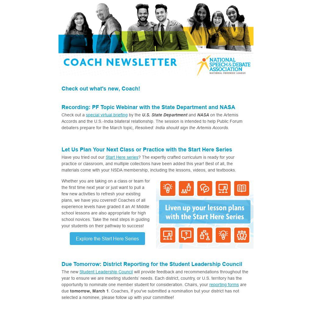 Register your students for FREE, after-school Springboard practice opportunities; no NSDA membership required. We have two asynchronous speech and live debate events on Thursday, March 9 and Tuesday, March 14. We also have two live speech and live debate events on Tuesday, March 2 and Tuesday, March 21. Registration closes at noon CT the day of the scrimmage.