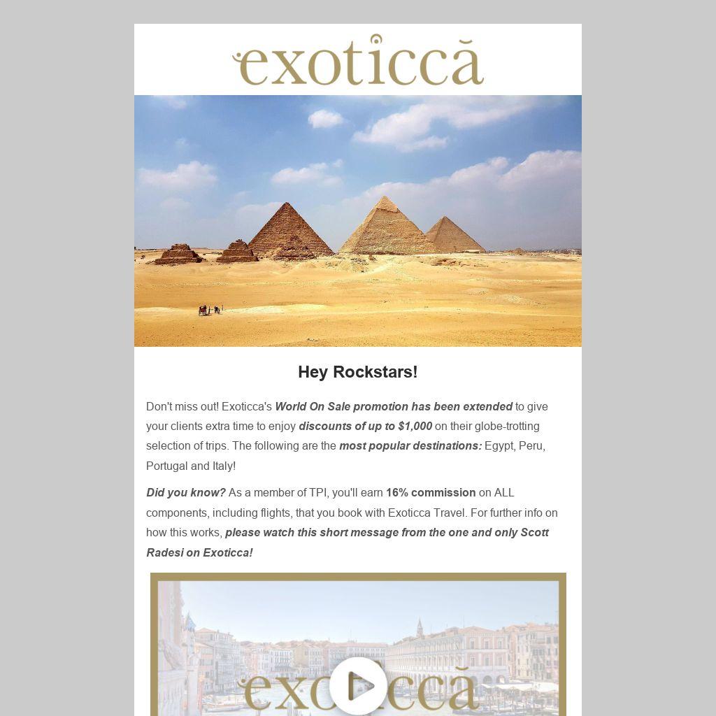 Don't miss out! Exoticca's World On Sale promotion has been extended to give your clients extra time to enjoy discounts of up to $1,000 on their globe-trotting selection of trips. The following are the most popular destinations: Egypt, Peru, Portugal and Italy!