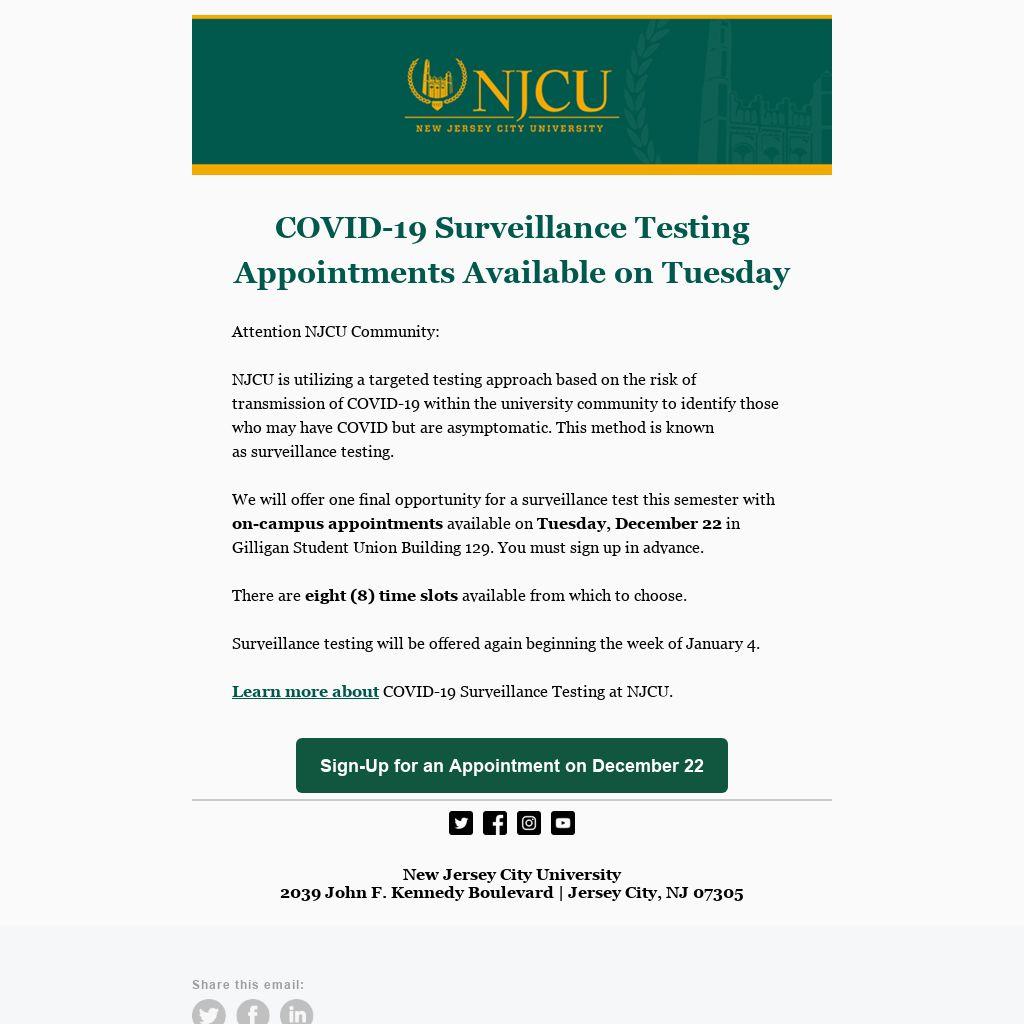 Learn more about COVID-19 Surveillance Testing at NJCU.