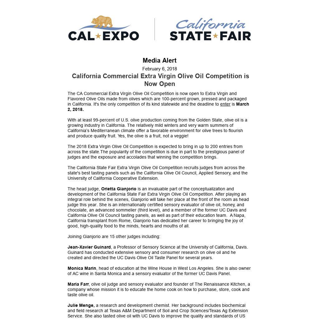 The judges will determine Best of Show winners, which will formally be announced at the State Capitol media event on June 21. Winners are also invited to showcase their olive oil during the Best of California Tasting reception prior to the California State Fair Gala on June 21 and throughout the CA State Fair from July 13 thru July 29.