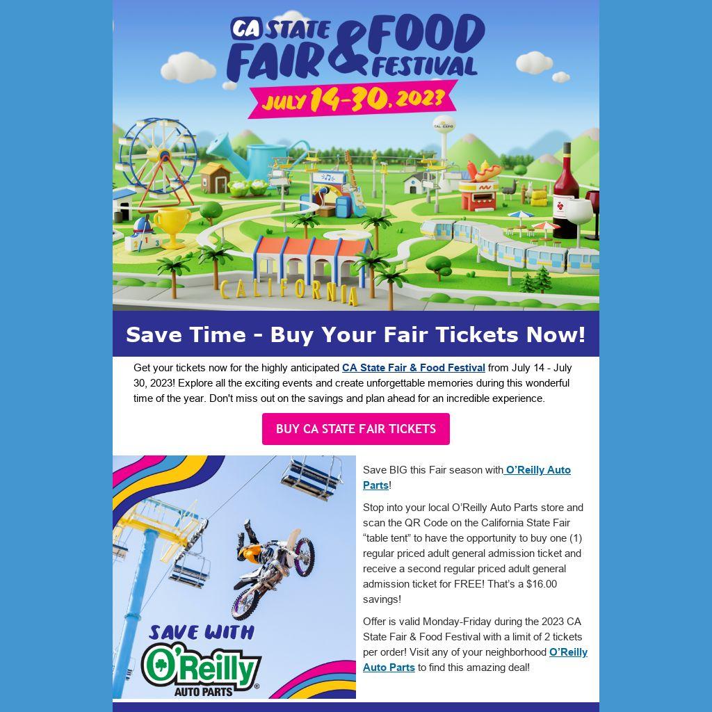 Offer is valid Monday-Friday during the 2023 CA State Fair & Food Festival with a limit of 2 tickets per order! Visit any of your neighborhood O’Reilly Auto Parts to find this amazing deal!