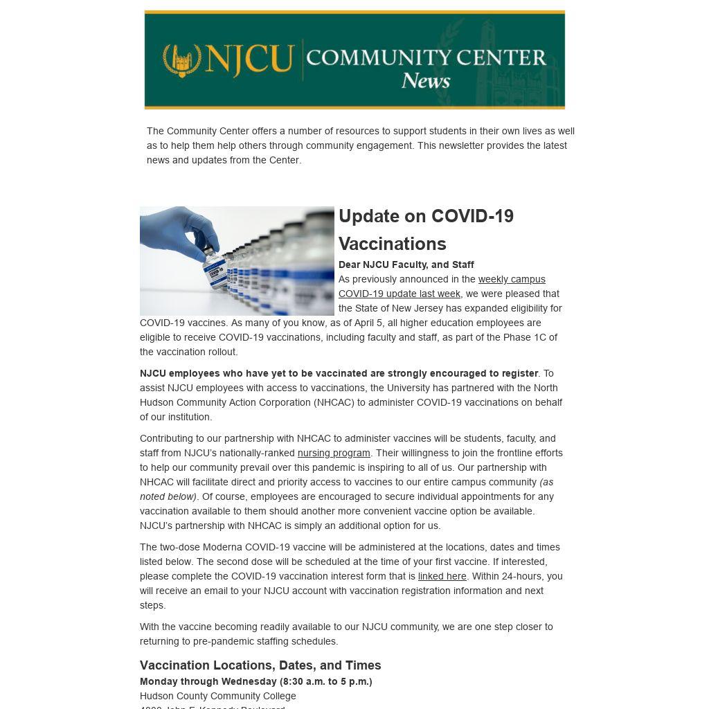 Dear NJCU Faculty, and Staff As previously announced in the weekly campus COVID-19 update last week, we were pleased that the State of New Jersey has expanded eligibility for COVID-19 vaccines. As many of you know, as of April 5, all higher education employees are eligible to receive COVID-19 vaccinations, including faculty and staff, as part of the Phase 1C of the vaccination rollout.