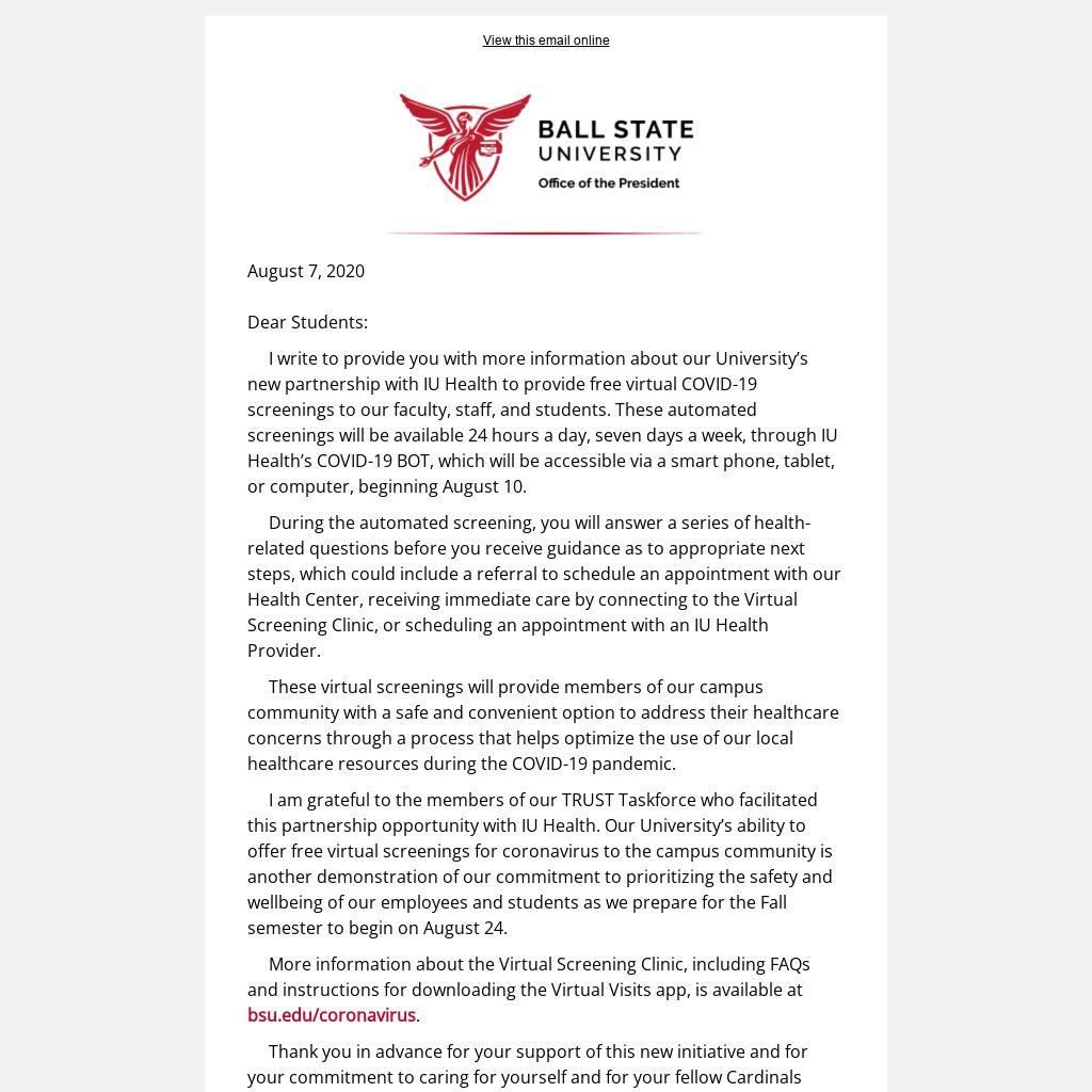 I write to provide you with more information about our University’s new partnership with IU Health to provide free virtual COVID-19 screenings to our faculty, staff, and students. These automated screenings will be available 24 hours a day, seven days a week, through IU Health’s COVID-19 BOT, which will be accessible via a smart phone, tablet, or computer, beginning August 10.