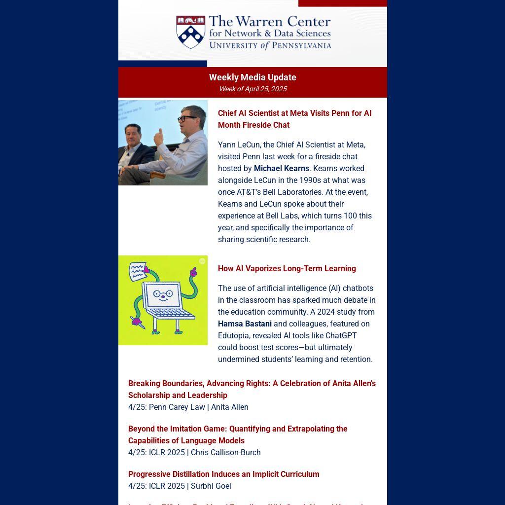 Yann LeCun, the Chief AI Scientist at Meta, visited Penn last week for a fireside chat hosted by Michael Kearns. Kearns worked alongside LeCun in the 1990s at what was once AT&T’s Bell Laboratories. At the event, Kearns and LeCun spoke about their experience at Bell Labs, which turns 100 this year, and specifically the importance of sharing scientific research.
