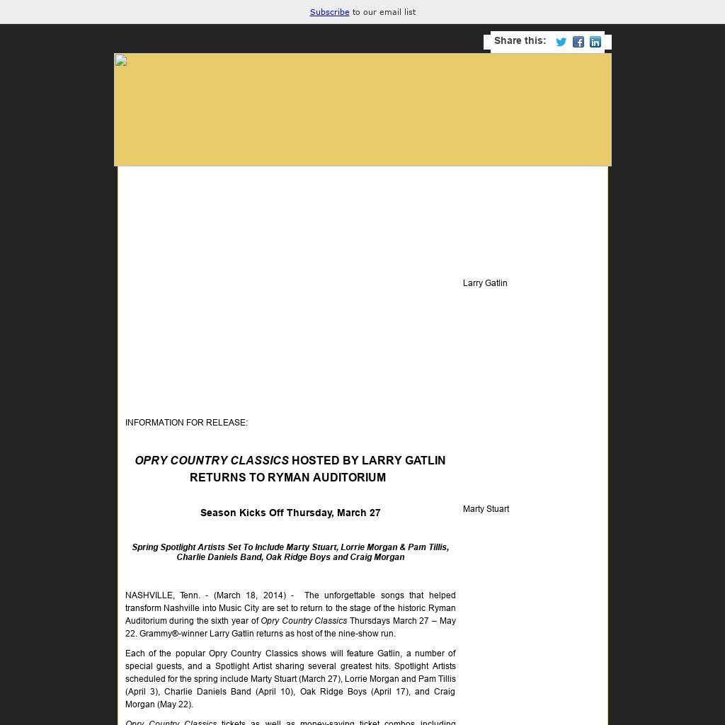 NASHVILLE, Tenn. - (March 18, 2014) - The unforgettable songs that helped transform Nashville into Music City are set to return to the stage of the historic Ryman Auditorium during the sixth year of Opry Country Classics Thursdays March 27 – May 22. Grammy®-winner Larry Gatlin returns as host of the nine-show run.