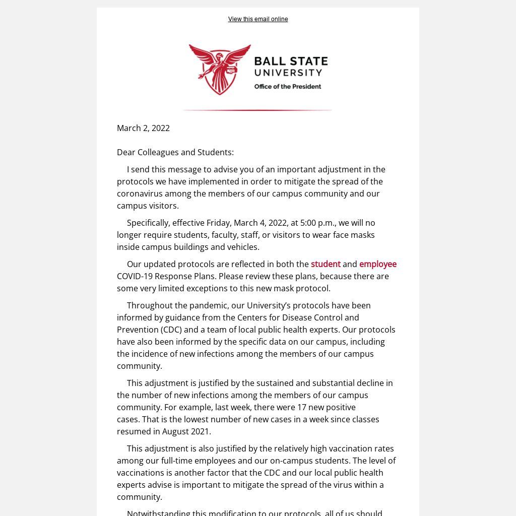 Specifically, effective Friday, March 4, 2022, at 5:00 p.m., we will no longer require students, faculty, staff, or visitors to wear face masks inside campus buildings and vehicles.