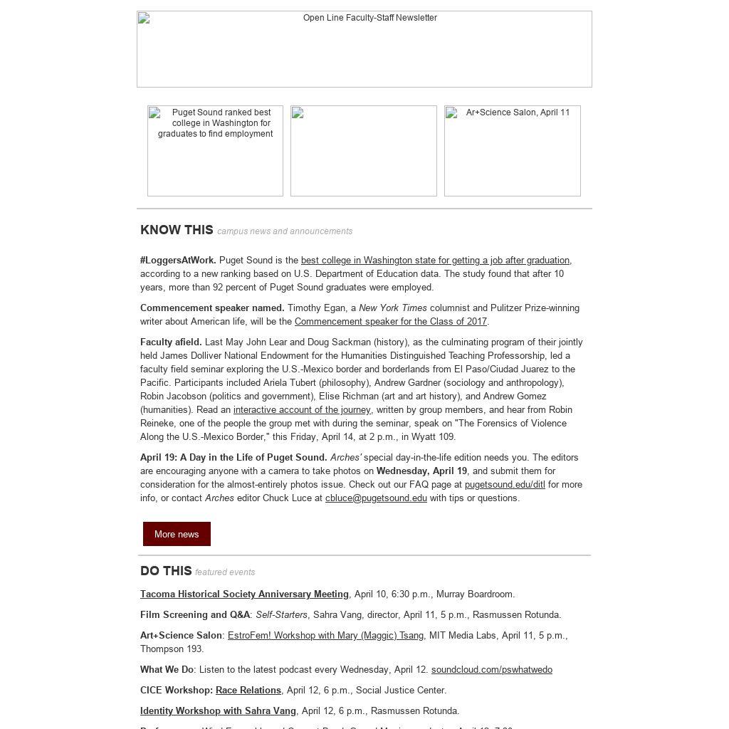 April 19: A Day in the Life of Puget Sound. Arches' special day-in-the-life edition needs you. The editors are encouraging anyone with a camera to take photos on Wednesday, April 19, and submit them for consideration for the almost-entirely photos issue. Check out our FAQ page at pugetsound.edu/ditl for more info, or contact Arches editor Chuck Luce at cbluce@pugetsound.edu with tips or questions.