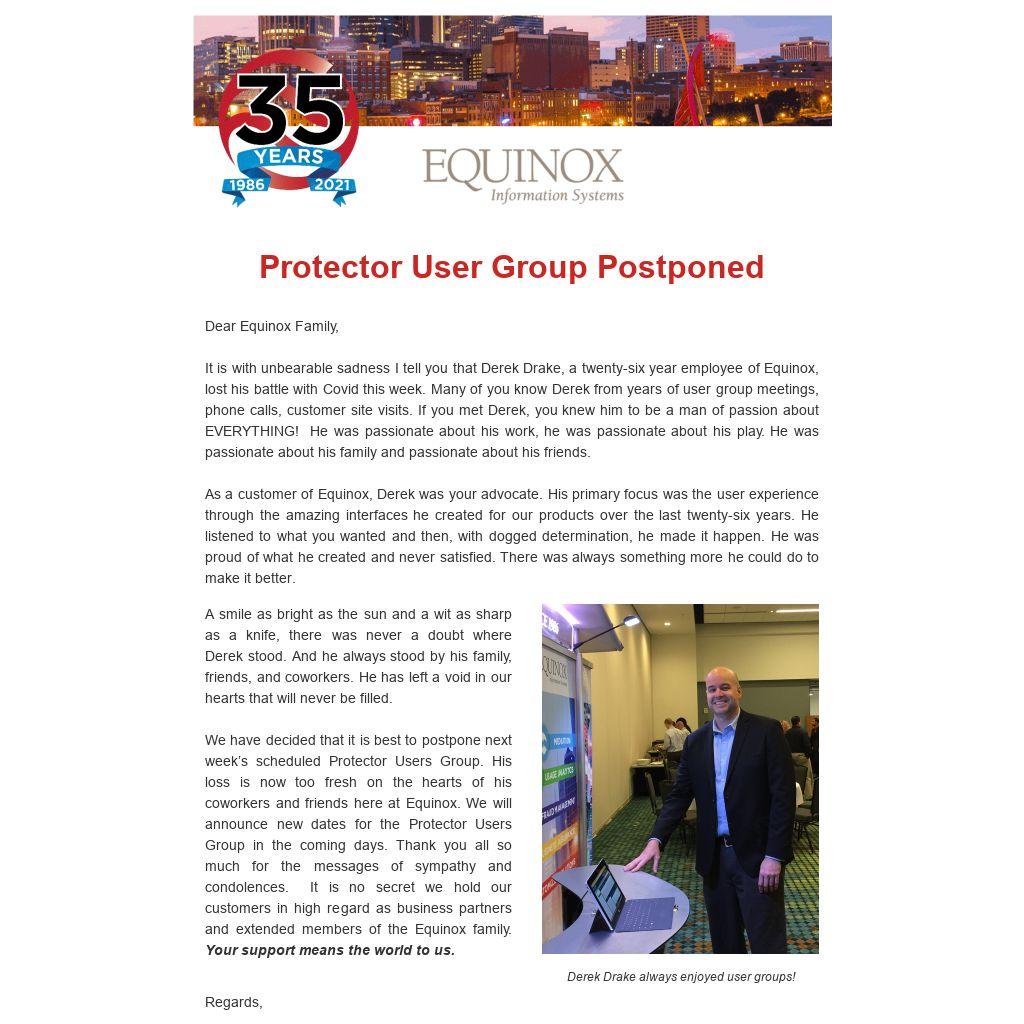 It is with unbearable sadness I tell you that Derek Drake, a twenty-six year employee of Equinox, lost his battle with Covid this week. Many of you know Derek from years of user group meetings, phone calls, customer site visits. If you met Derek, you knew him to be a man of passion about EVERYTHING! He was passionate about his work, he was passionate about his play. He was passionate about his family and passionate about his friends.