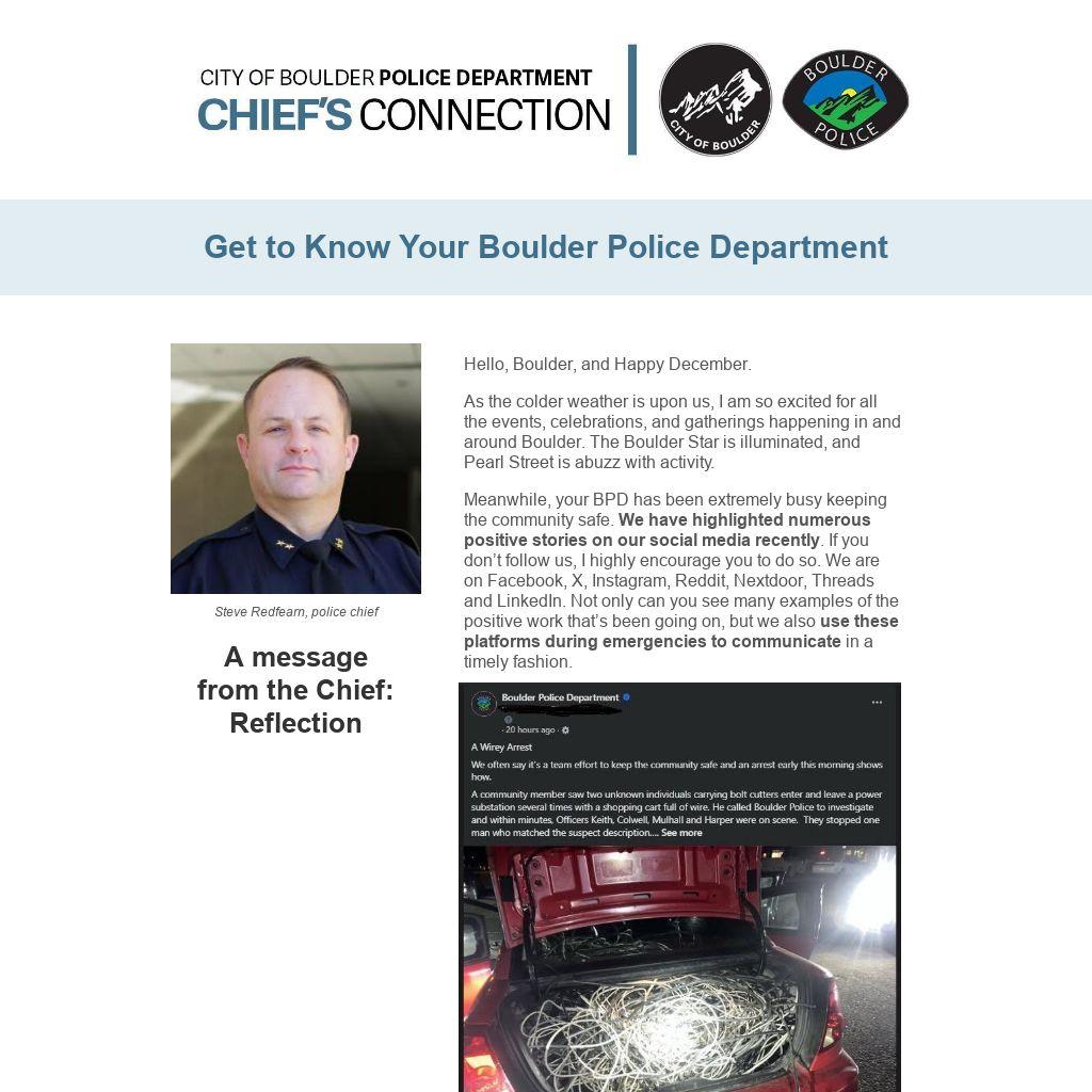 I hope that this season finds you engaged in old traditions, or new traditions being made for the first time. Regardless, your BPD will be here if you need us. A big shoutout to all of our staff who will be working throughout the holidays, taking time away from their own families to protect our community. If you see them out and about, please thank them for their commitment to keeping our community safe, 24/7/365.