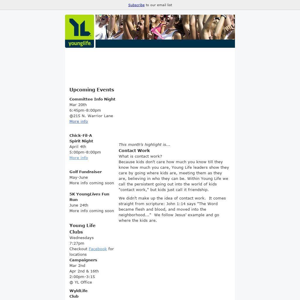 1. On the 20th Dave Goy (our Young Life Regional Director) is coming to Waukee to share about committee and the need for adults to volunteer on committee.