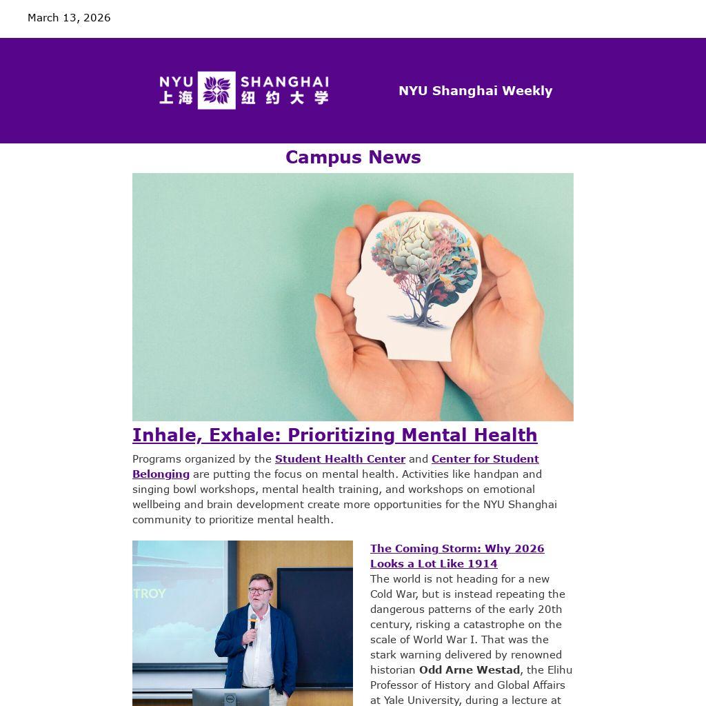 For a complete listing of events at NYU Shanghai, check out the Weekly Events Newsletter, delivered to your inbox every Monday when school is in session. If you wish to highlight your event in the Weekly Events Newsletter, upload your event to Engage no later than the Thursday before the Monday newsletter.