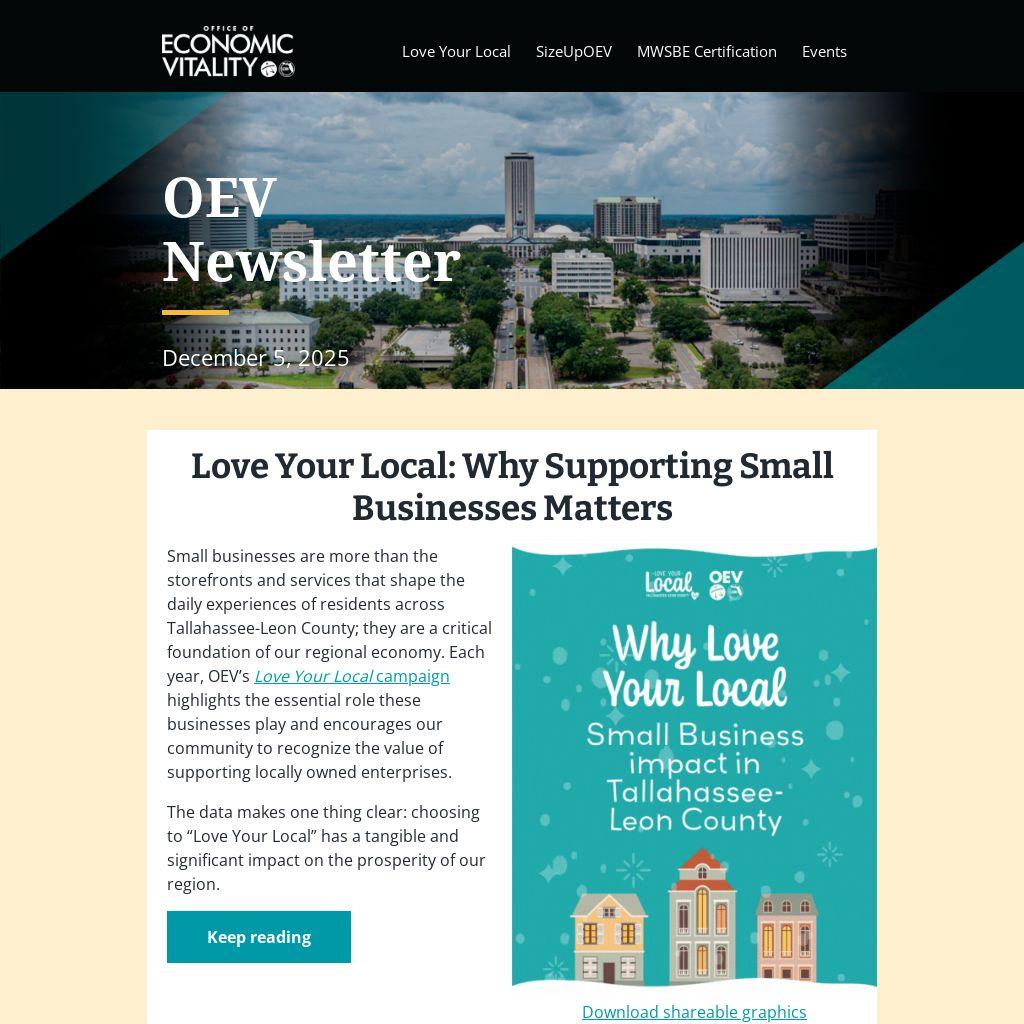 Small businesses are more than the storefronts and services that shape the daily experiences of residents across Tallahassee-Leon County; they are a critical foundation of our regional economy. Each year, OEV’s Love Your Local campaign highlights the essential role these businesses play and encourages our community to recognize the value of supporting locally owned enterprises.
