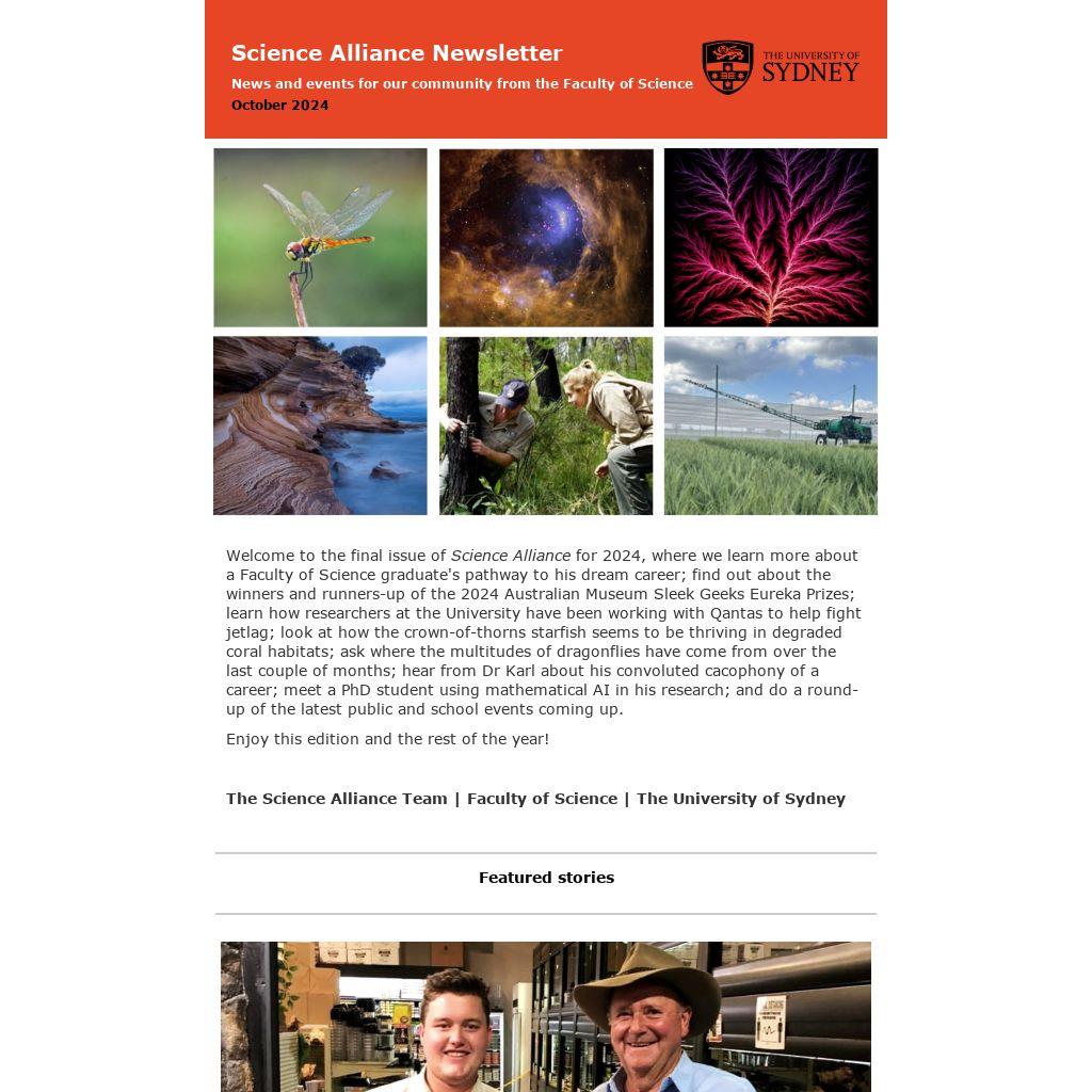Welcome to the final issue of Science Alliance for 2024, where we learn more about a Faculty of Science graduate's pathway to his dream career; find out about the winners and runners-up of the 2024 Australian Museum Sleek Geeks Eureka Prizes; learn how researchers at the University have been working with Qantas to help fight jetlag; look at how the crown-of-thorns starfish seems to be thriving in degraded coral habitats; ask where the multitudes of dragonflies have come from over the last couple of months; hear from Dr Karl about his convoluted cacophony of a career; meet a PhD student using mathematical AI in his research; and do a round-up of the latest public and school events coming up.