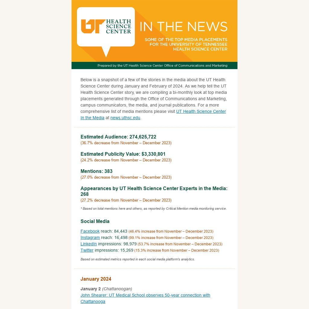 Below is a snapshot of a few of the stories in the media about the UT Health Science Center during January and February of 2024. As we help tell the UT Health Science Center story, we are compiling a bi-monthly look at top media placements generated through the Office of Communications and Marketing, campus communicators, the media, and journal publications. For a more comprehensive list of media mentions please visit UT Health Science Center In the Media at news.uthsc.edu.