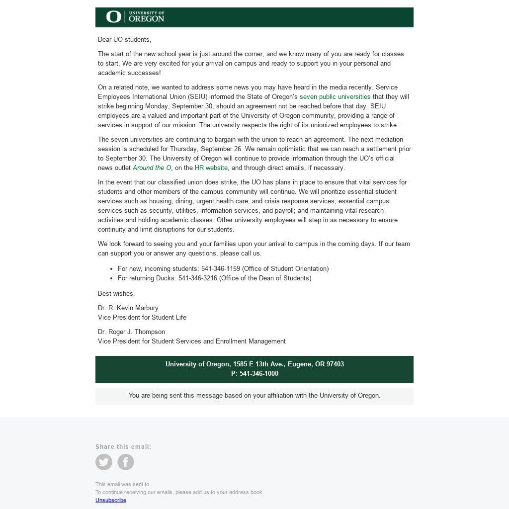 On a related note, we wanted to address some news you may have heard in the media recently. Service Employees International Union (SEIU) informed the State of Oregon’s seven public universities that they will strike beginning Monday, September 30, should an agreement not be reached before that day. SEIU employees are a valued and important part of the University of Oregon community, providing a range of services in support of our mission. The university respects the right of its unionized employees to strike.