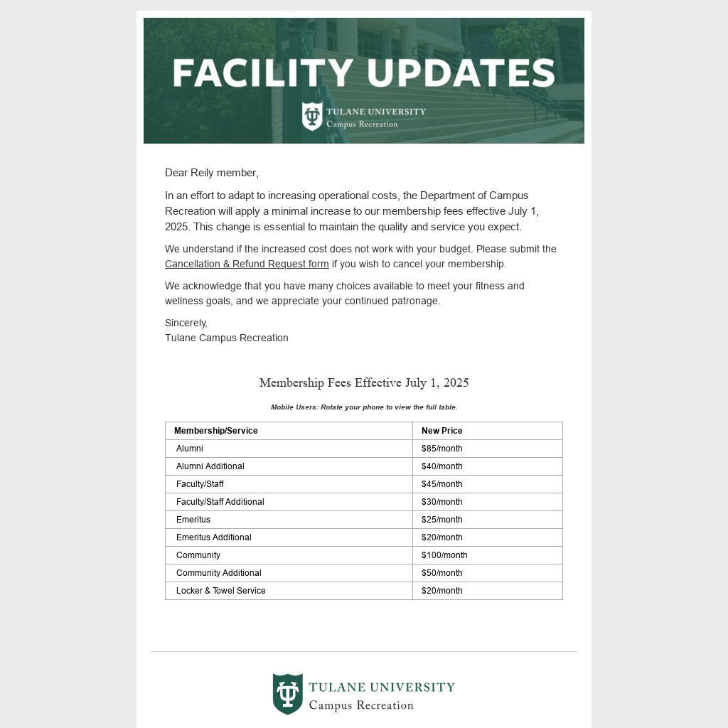 In an effort to adapt to increasing operational costs, the Department of Campus Recreation will apply a minimal increase to our membership fees effective July 1, 2025. This change is essential to maintain the quality and service you expect.