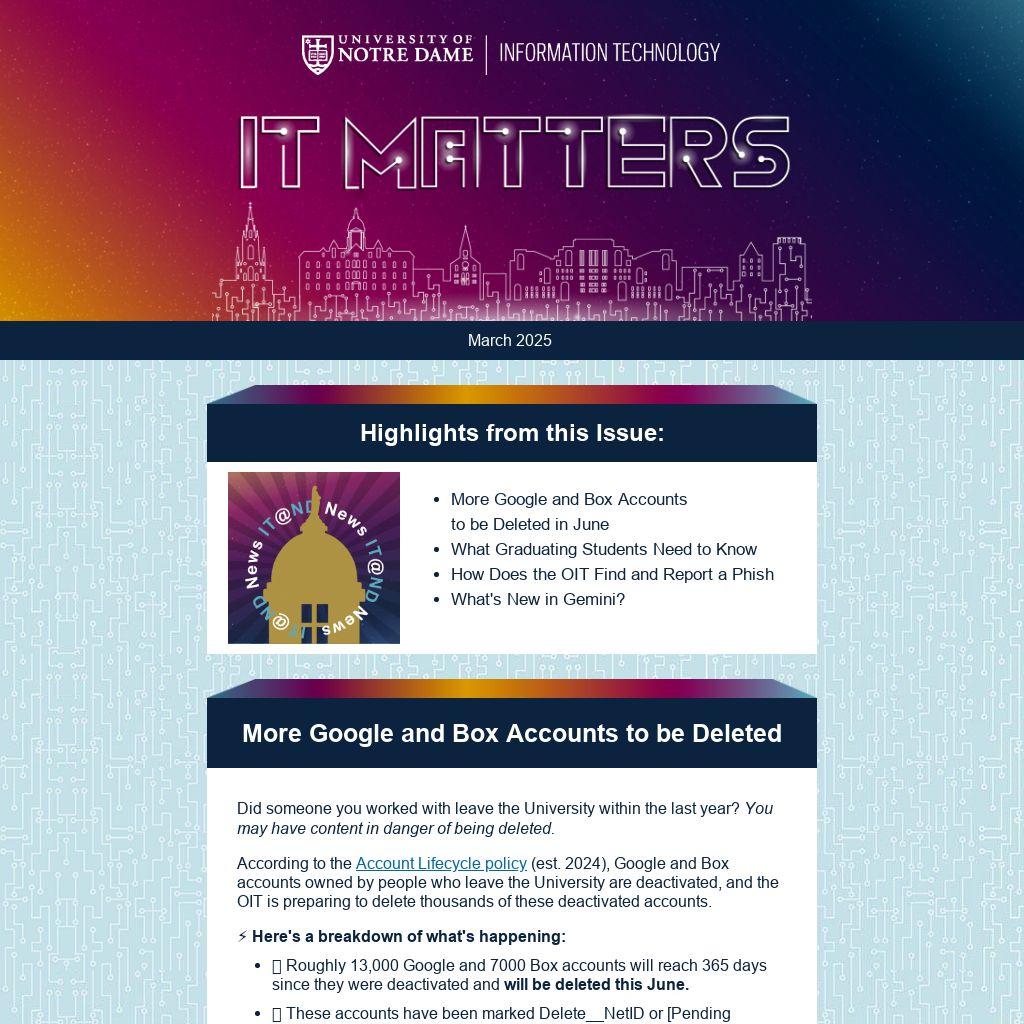 REMINDER: Content created by any graduating student while at Notre Dame will be deleted in July. Be sure any documents and files your student worker(s) created and/or own are stored in a Shared Drive.