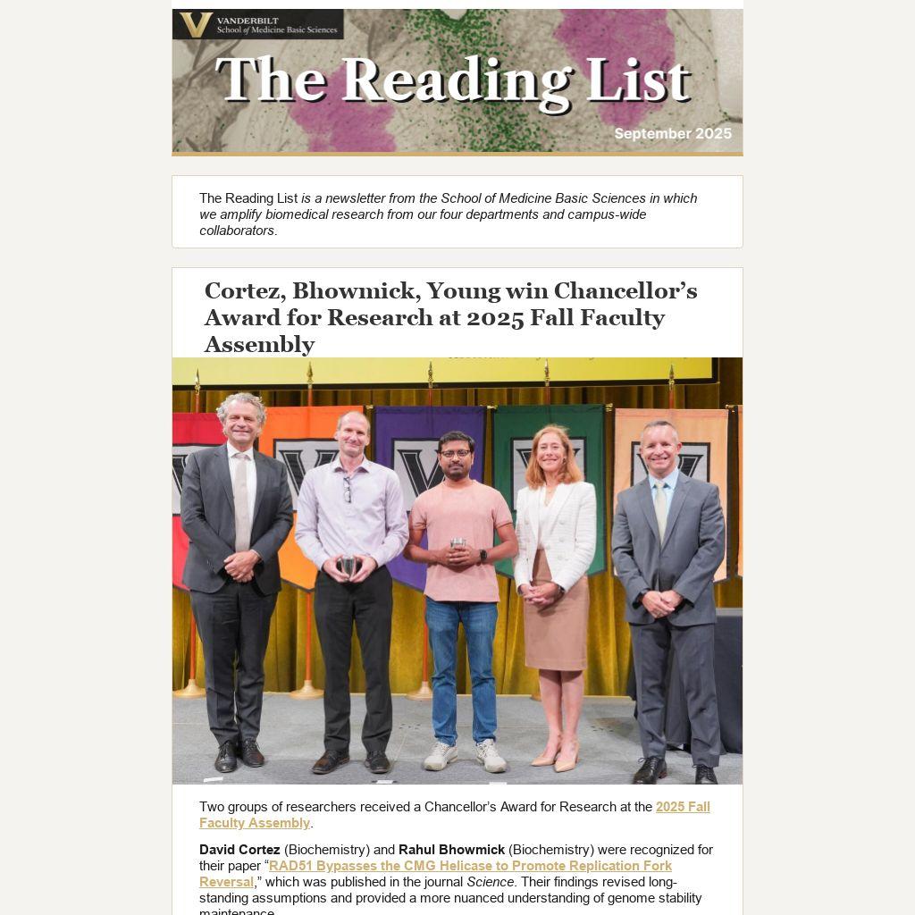 The Reading List is a newsletter from the School of Medicine Basic Sciences in which we amplify biomedical research from our four departments and campus-wide collaborators.