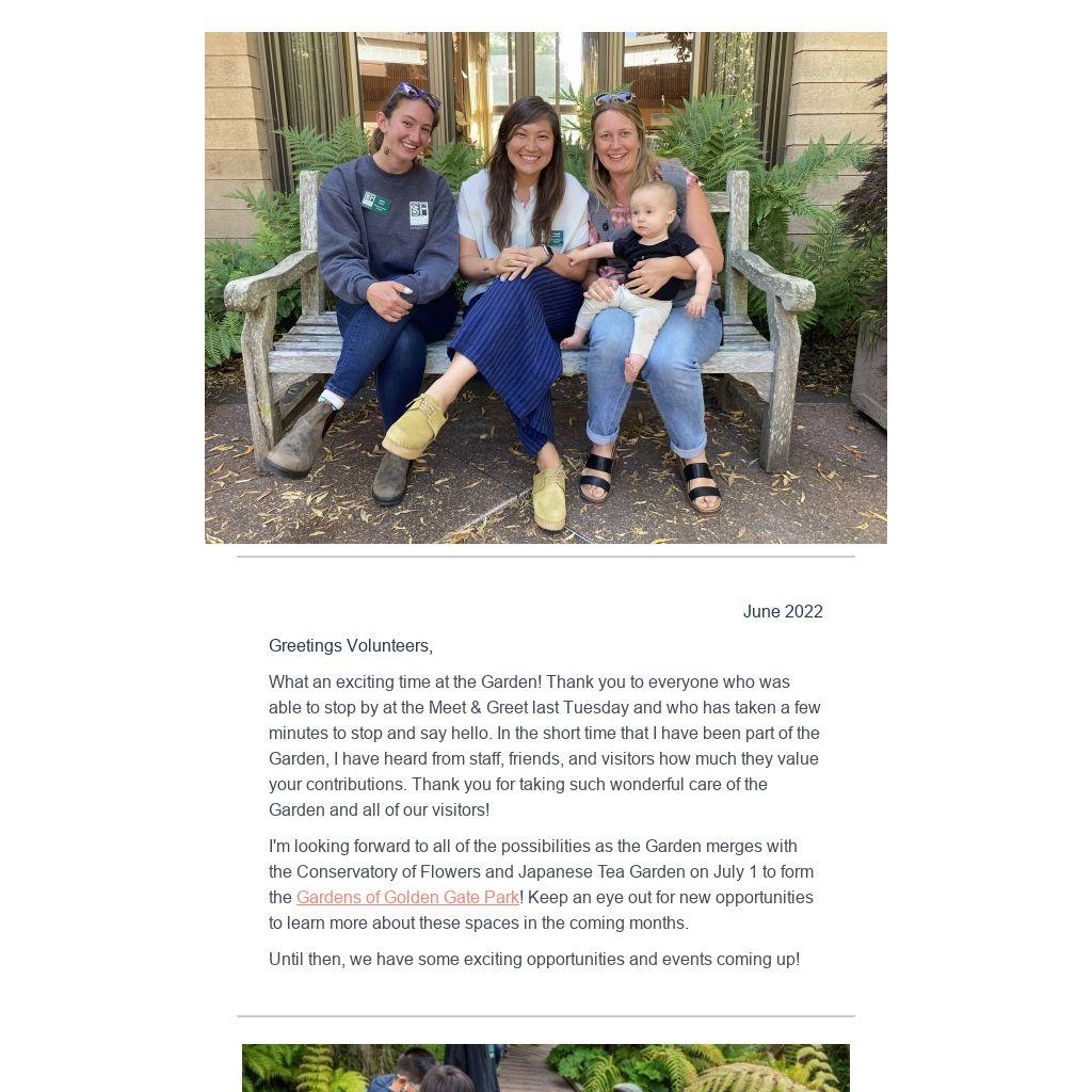 I'm looking forward to all of the possibilities as the Garden merges with the Conservatory of Flowers and Japanese Tea Garden on July 1 to form the Gardens of Golden Gate Park! Keep an eye out for new opportunities to learn more about these spaces in the coming months.