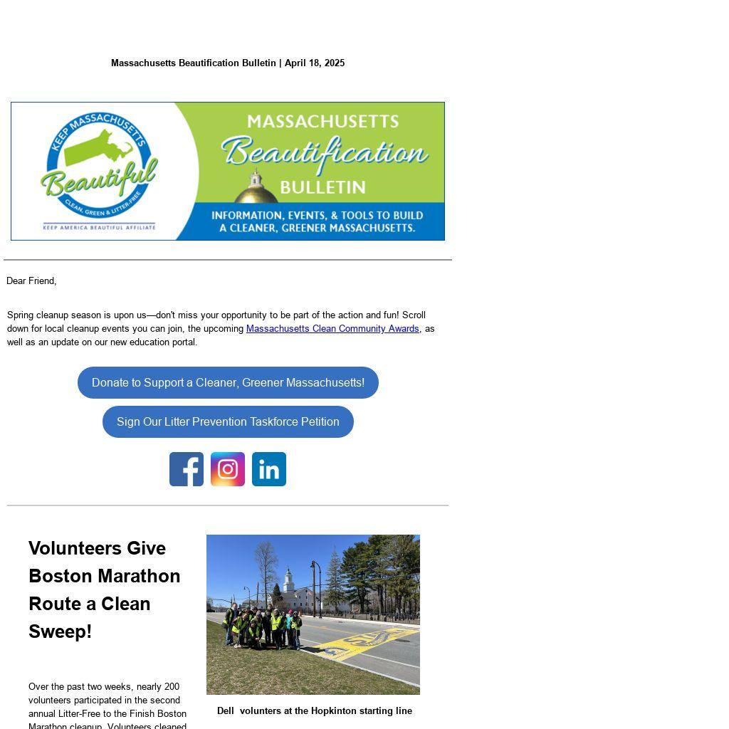 This cleanup helps the Greater Boston area put its best foot forward as thousands of runners and spectators visit our region to enjoy the Boston Marathon. Thank you to the organizers and volunteers who participated in this event!