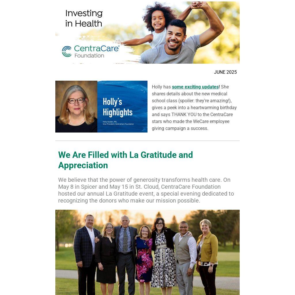 Holly has some exciting updates! She shares details about the new medical school class (spoiler: they're amazing!), gives a peek into a heartwarming birthday and says THANK YOU to the CentraCare stars who made the WeCare employee giving campaign a success.