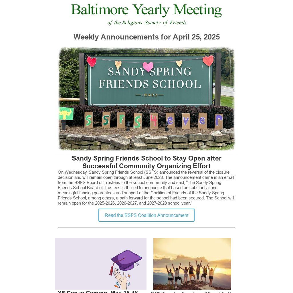 On Wednesday, Sandy Spring Friends School (SSFS) announced the reversal of the closure decision and will remain open through at least June 2028. The announcement came in an email from the SSFS Board of Trustees to the school community and said, “The Sandy Spring Friends School Board of Trustees is thrilled to announce that based on substantial and meaningful funding guarantees and support of the Coalition of Friends of the Sandy Spring Friends School, among others, a path forward for the school had been secured. The School will remain open for the 2025-2026, 2026-2027, and 2027-2028 school year.”