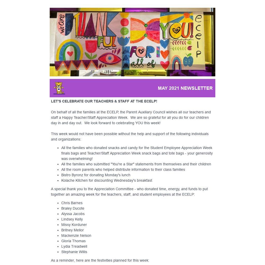 On behalf of all the families at the ECELP, the Parent Auxiliary Council wishes all our teachers and staff a Happy Teacher/Staff Appreciation Week. We are so grateful for all you do for our children day in and day out. We look forward to celebrating YOU this week!