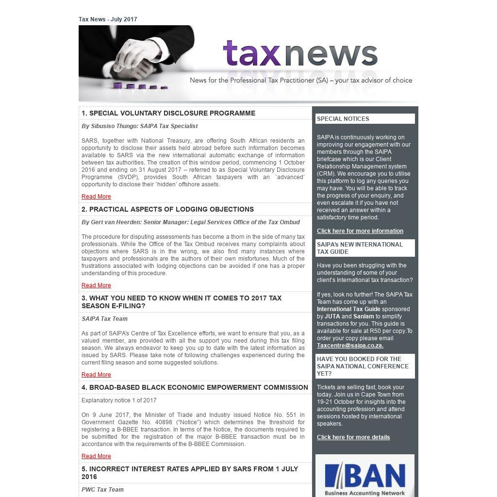 SARS applied the incorrect interest rates from 1 July 2016. Adjustments were made to the SARS system on 1July 2017 with retrospective effect and as a result some taxpayers may be adversely affected. | | Read More | | 6. ABP national workshop | | The Association of B-BBEE Professionals (ABP) will be presenting a series of monthly nationwide workshops from August to November 2017, focusing on specific scorecard elements. The big question to be addressed : is your ownership structure in line with amended codes or amended sector codes? | | Click here for dates and to book your seat | | SARS ALERTS AND RELEASES | | 7. Introduction of improvements to the dispute management process | | On 30 June 2017, SARS introduced an automated dispute management process for PAYE as part of their ongoing commitment to delivering a better service to taxpayers. | | Read More | | 8. Interpretation Note 96 | Section 10(1)(o)(ia) subject: Exemption from income tax: Remuneration derived by a person as an officer or crew member of a South African ship