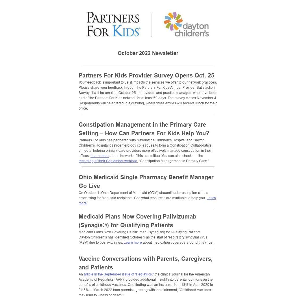 If you have questions regarding any of the information in this newsletter or suggestions regarding newsletter content that would be useful to your practice, please contact us at PFKProRelations@childrensdayton.org.