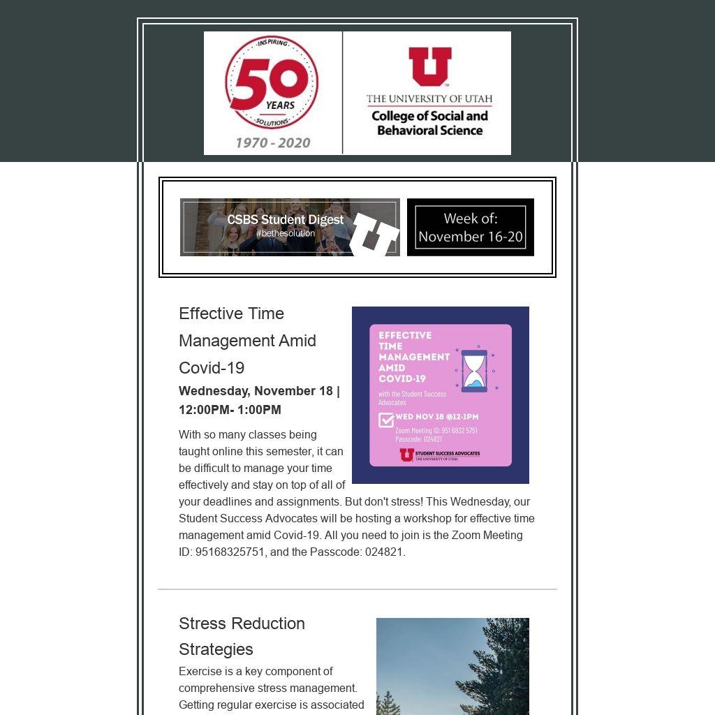 CSBS Student Success Center Beacons of Excellence AwardThe CSBS Student Success Center has been recognized as a 2020 recipient for the University of Utah Beacons of Excellence Award. This well-deserved recognition is bestowed due to the nominations received from several students who described the CSBS Student Success Center as providing “an absolutely transformative educational experience.”