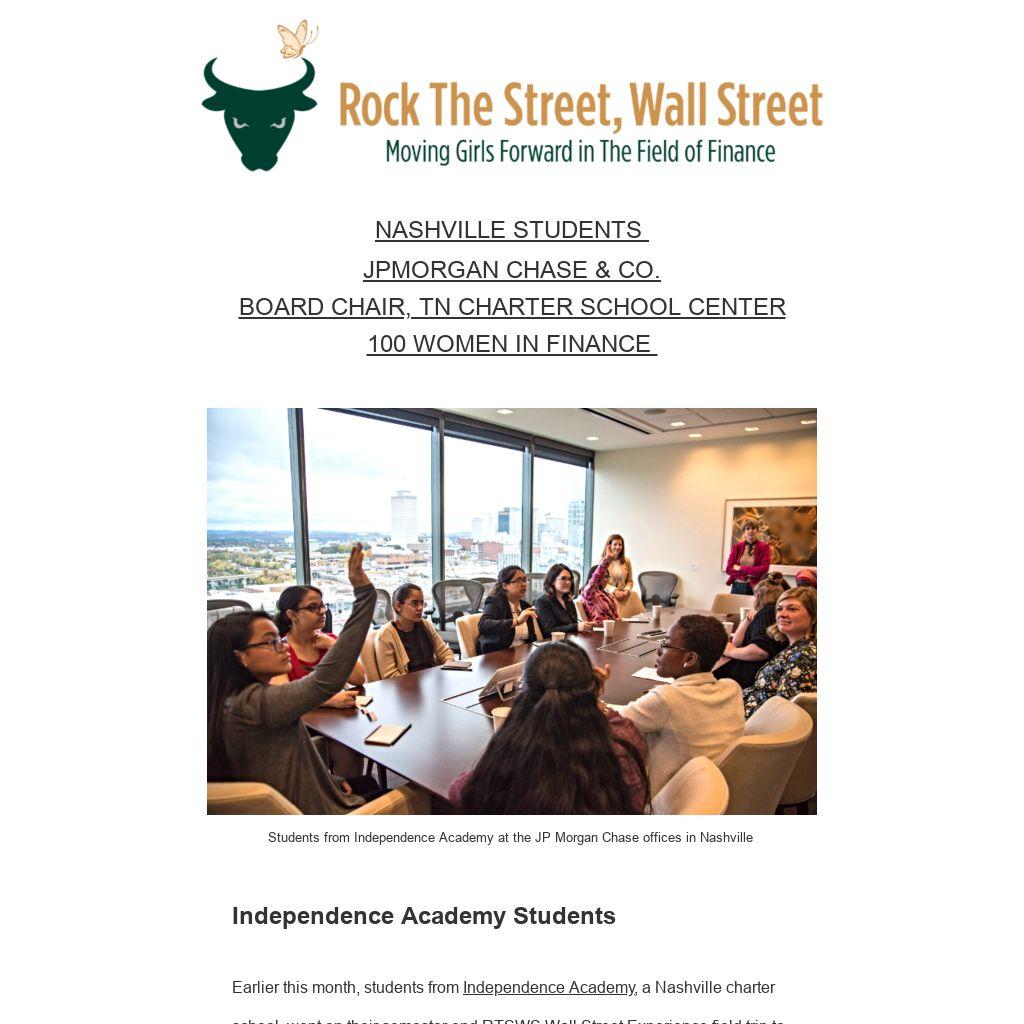 Earlier this month, students from Independence Academy, a Nashville charter school, went on their semester end RTSWS Wall Street Experience field trip to the JPMorgan Chase offices. The field trip represents the second of three components of the RTSWS academic year long program. Those components are: