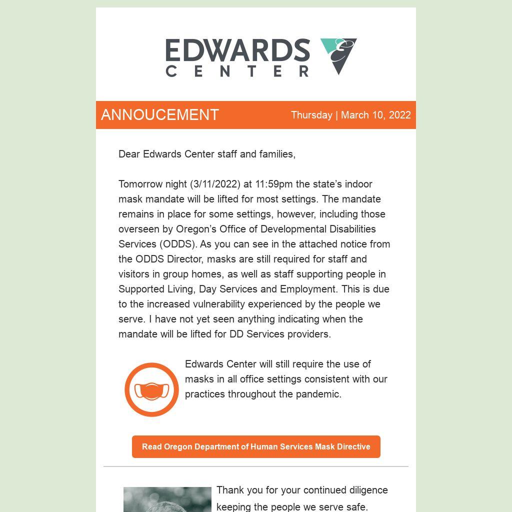 Tomorrow night (3/11/2022) at 11:59pm the state’s indoor mask mandate will be lifted for most settings. The mandate remains in place for some settings, however, including those overseen by Oregon’s Office of Developmental Disabilities Services (ODDS). As you can see in the attached notice from the ODDS Director, masks are still required for staff and visitors in group homes, as well as staff supporting people in Supported Living, Day Services and Employment. This is due to the increased vulnerability experienced by the people we serve. I have not yet seen anything indicating when the mandate will be lifted for DD Services providers.