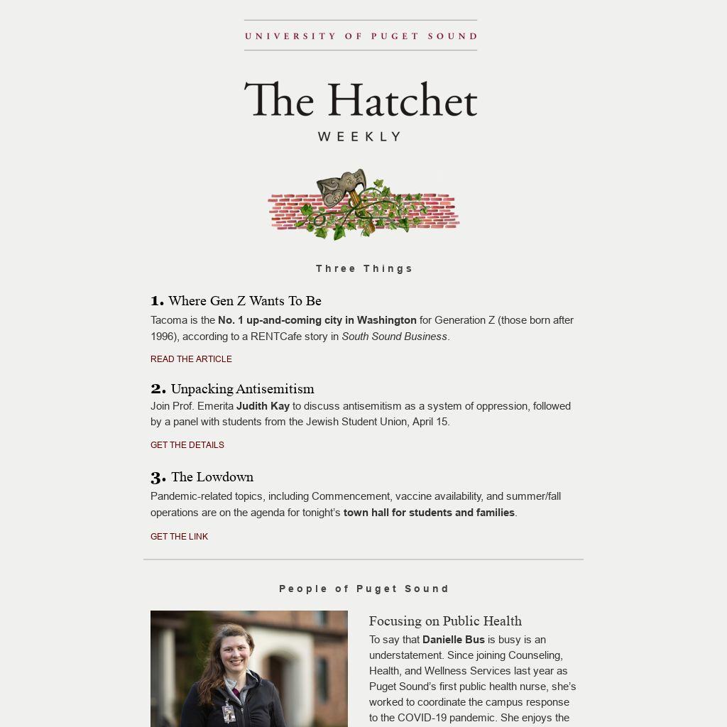To say that Danielle Bus is busy is an understatement. Since joining Counseling, Health, and Wellness Services last year as Puget Sound’s first public health nurse, she’s worked to coordinate the campus response to the COVID-19 pandemic. She enjoys the process of contact tracing, answering questions, and helping people navigate the complexities of testing and quarantining. Being a registered nurse is Bus’ second career after many years as an educator, and she finds that her time in the classroom, coupled with her own experience going back to school, makes it easy to relate to students. A newcomer to the Pacific Northwest, she tries to make time to read, hike, explore Washington’s natural beauty, and work on developing her cooking skills.