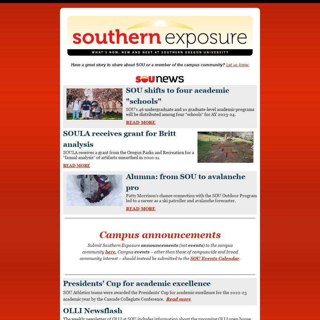 Submit Southern Exposure announcements (not events) to the campus community here. Campus events – other than those of campuswide and broad community interest – should instead be submitted to the SOU Events Calendar.