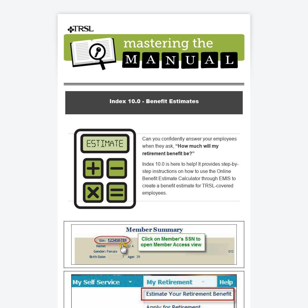 Index 10.0 is here to help! It provides step-by-step instructions on how to use the Online Benefit Estimate Calculator through EMIS to create a benefit estimate for TRSL-covered employees.