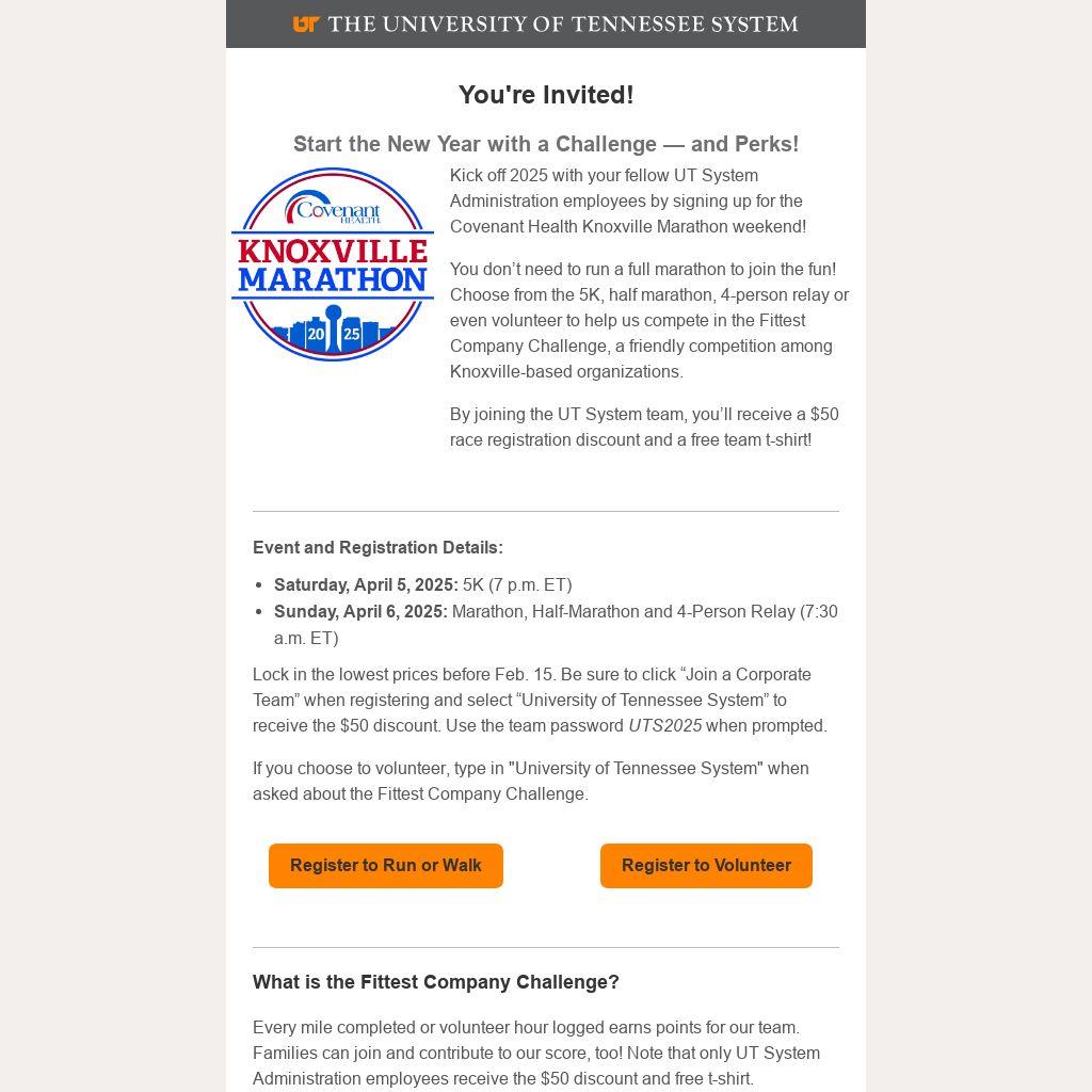 Kick off 2025 with your fellow UT System Administration employees by signing up for the Covenant Health Knoxville Marathon weekend!