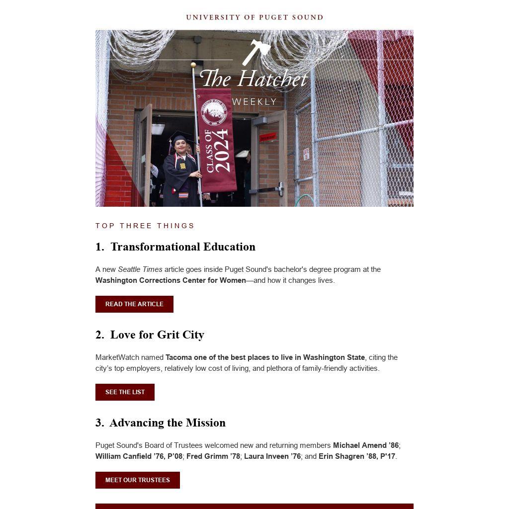 Do you know an exceptional Logger alum? Nominate them for the 2025 Distinguished Alumni Awards! Categories include Professional Achievement, Young Logger Service, Service to Puget Sound, and Service to Community. Nominations are due August 31. Award recipients will be honored at a special ceremony at Summer Reunion Weekend, June 6–8, 2025.