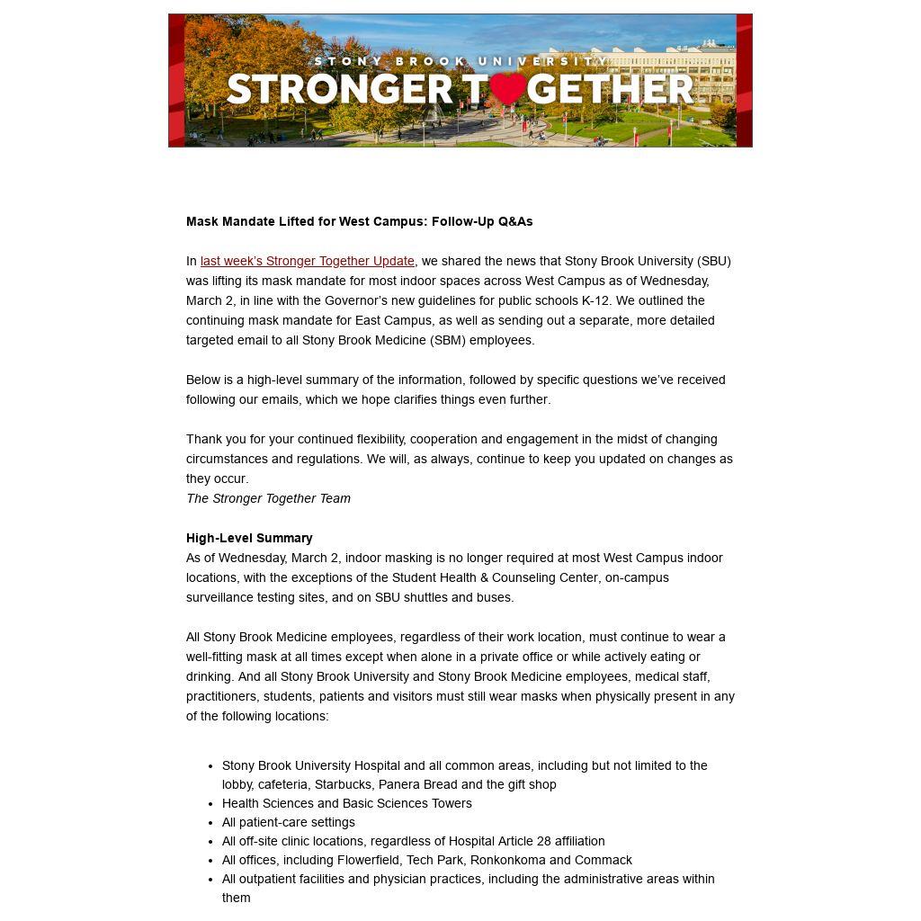 In last week’s Stronger Together Update, we shared the news that Stony Brook University (SBU) was lifting its mask mandate for most indoor spaces across West Campus as of Wednesday, March 2, in line with the Governor’s new guidelines for public schools K-12. We outlined the continuing mask mandate for East Campus, as well as sending out a separate, more detailed targeted email to all Stony Brook Medicine (SBM) employees.