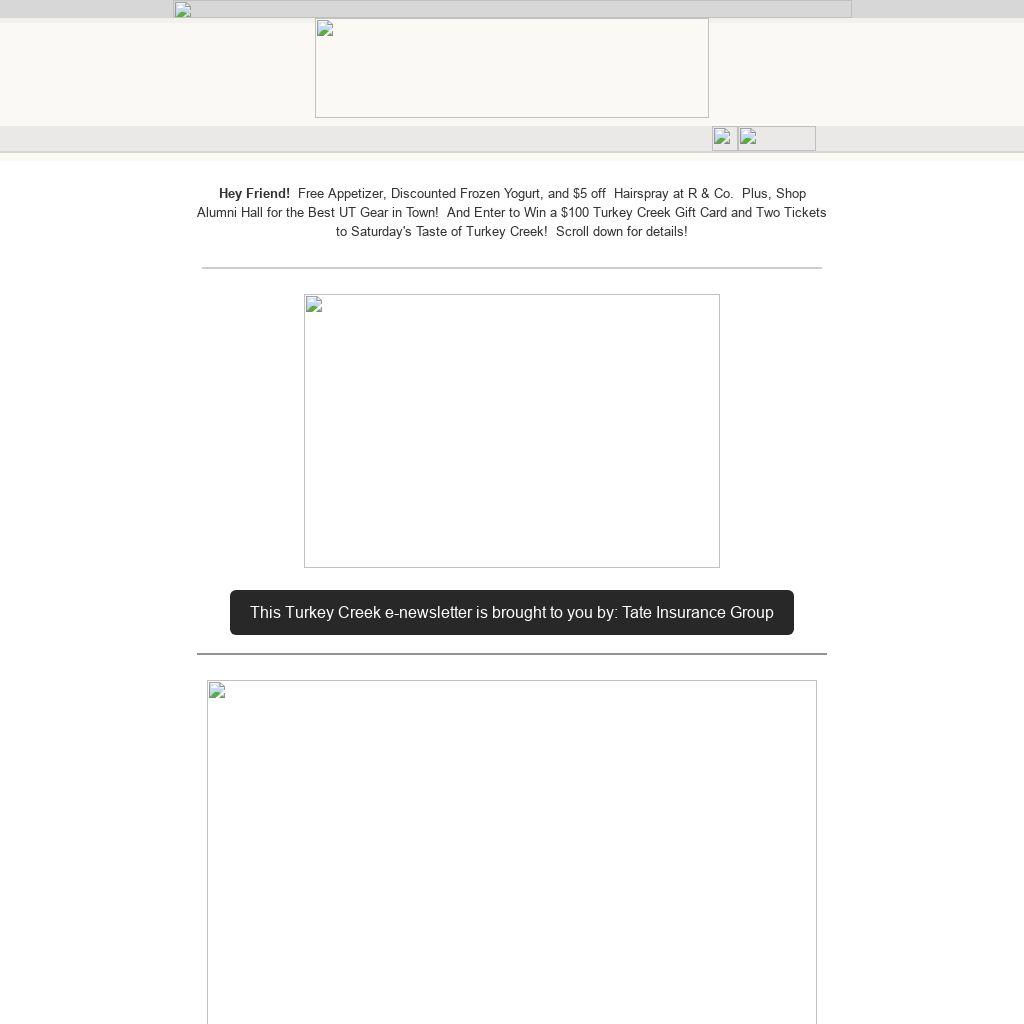 Hey Friend! Free Appetizer, Discounted Frozen Yogurt, and $5 off Hairspray at R & Co. Plus, Shop Alumni Hall for the Best UT Gear in Town! And Enter to Win a $100 Turkey Creek Gift Card and Two Tickets to Saturday's Taste of Turkey Creek! Scroll down for details!