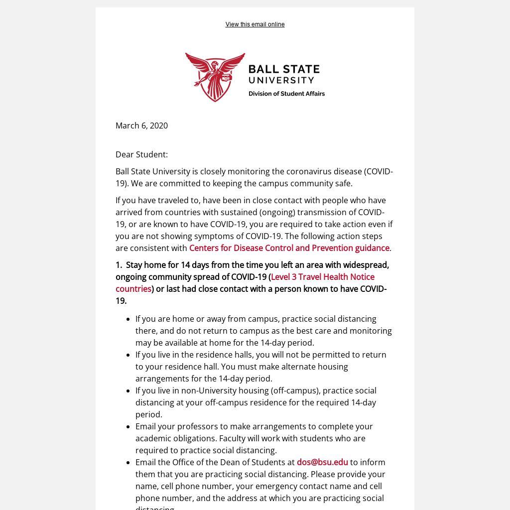 - Email the Office of the Dean of Students at dos@bsu.edu to inform them that you are practicing social distancing. Please provide your name, cell phone number, your emergency contact name and cell phone number, and the address at which you are practicing social distancing.