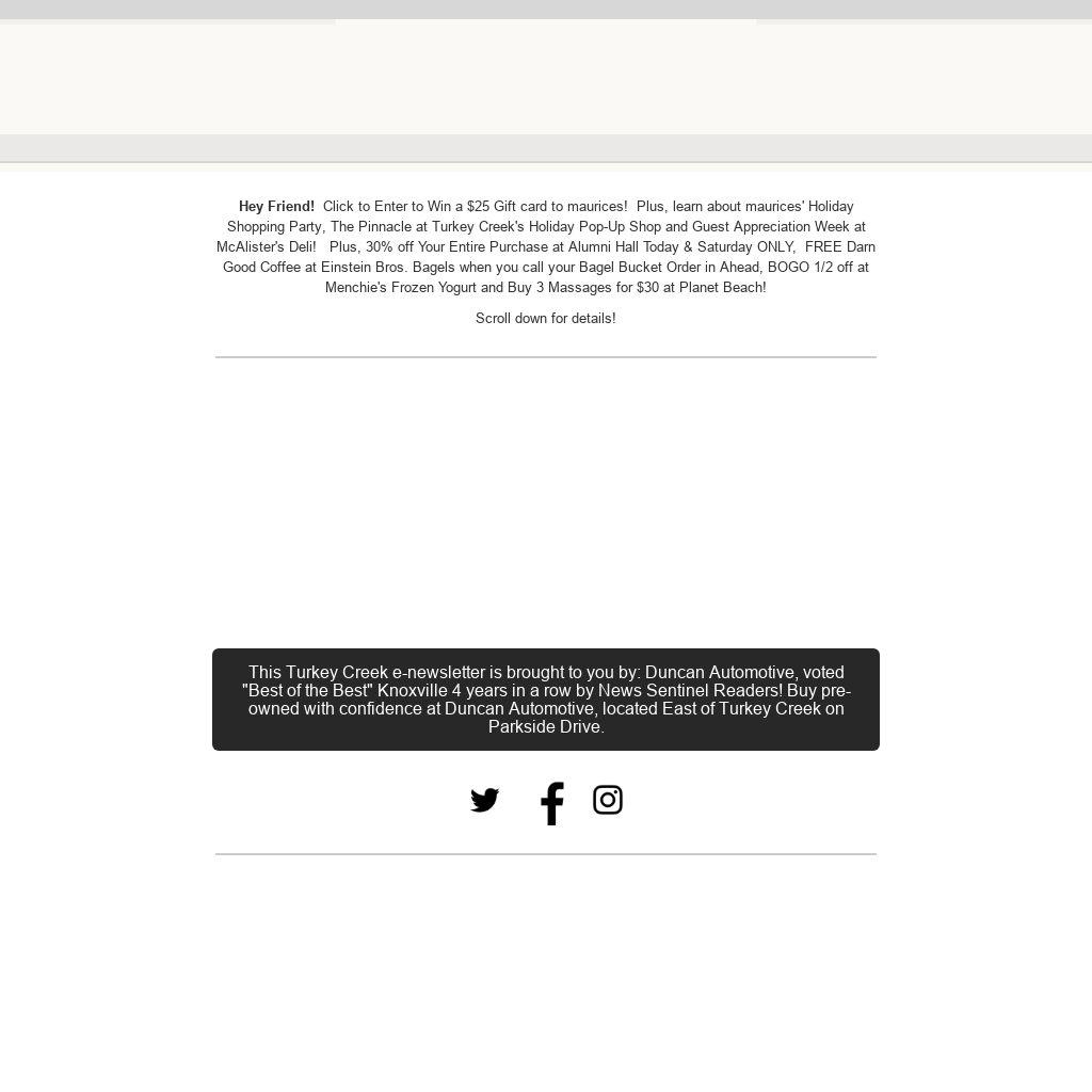 Hey Friend! Click to Enter to Win a $25 Gift card to maurices! Plus, learn about maurices' Holiday Shopping Party, The Pinnacle at Turkey Creek's Holiday Pop-Up Shop and Guest Appreciation Week at McAlister's Deli! Plus, 30% off Your Entire Purchase at Alumni Hall Today & Saturday ONLY, FREE Darn Good Coffee at Einstein Bros. Bagels when you call your Bagel Bucket Order in Ahead, BOGO 1/2 off at Menchie's Frozen Yogurt and Buy 3 Massages for $30 at Planet Beach!
