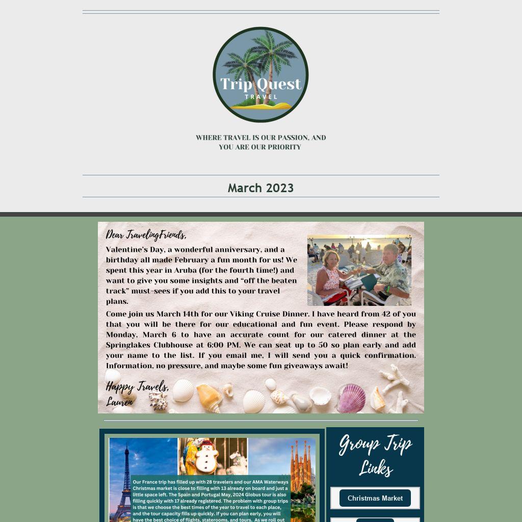I am Lauren Williams, owner of Trip Quest Travel Services for the past seven years. Moving from three decades in education to becoming a travel consultant has caused me to shift from “The Doctor of Education” to “The Doctor of Travel.” My clients are often just like me – they want a rejuvenating vacation that teaches them about the world and the cultures around them. I love beautiful scenery, exploring new places, and learning something new every day! Aside from travel, I stay busy with my husband, Steve, and our four children and thirteen grandchildren. Being active in the church and in our community feeds our souls as well. I love to play pickleball and bridge when I am not helping clients plan that perfect trip! Because our world is so much smaller now, I am happy to work with clients wherever they might live…but by referral only. Let me know if you have friends or family who would like to added to my monthly newsletter list! Also, let me know if there is something you’d like to know more about!