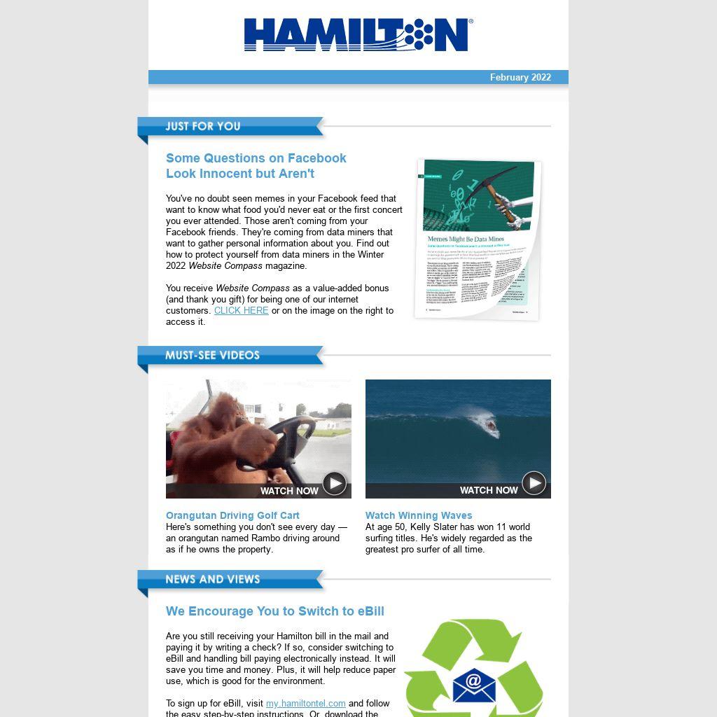 Are you still receiving your Hamilton bill in the mail and paying it by writing a check? If so, consider switching to eBill and handling bill paying electronically instead. It will save you time and money. Plus, it will help reduce paper use, which is good for the environment. To sign up for eBill, visit my.hamiltontel.com and follow the easy step-by-step instructions. Or, download the eBill Mobile App to your mobile device and set up your account. Call us at 402.694.5101 if you have questions. |