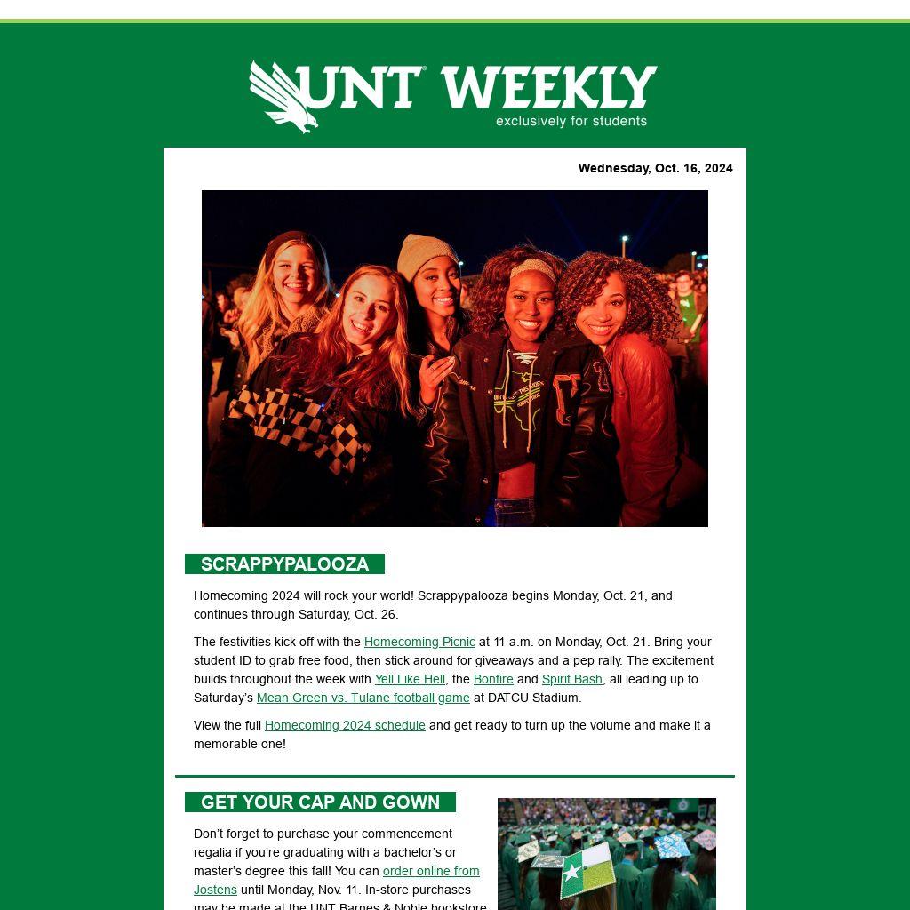 Don’t forget to purchase your commencement regalia if you’re graduating with a bachelor’s or master’s degree this fall! You can order online from Jostens until Monday, Nov. 11. In-store purchases may be made at the UNT Barnes & Noble bookstore until Nov. 22; however, keep in mind that inventory may run low as the big day approaches.