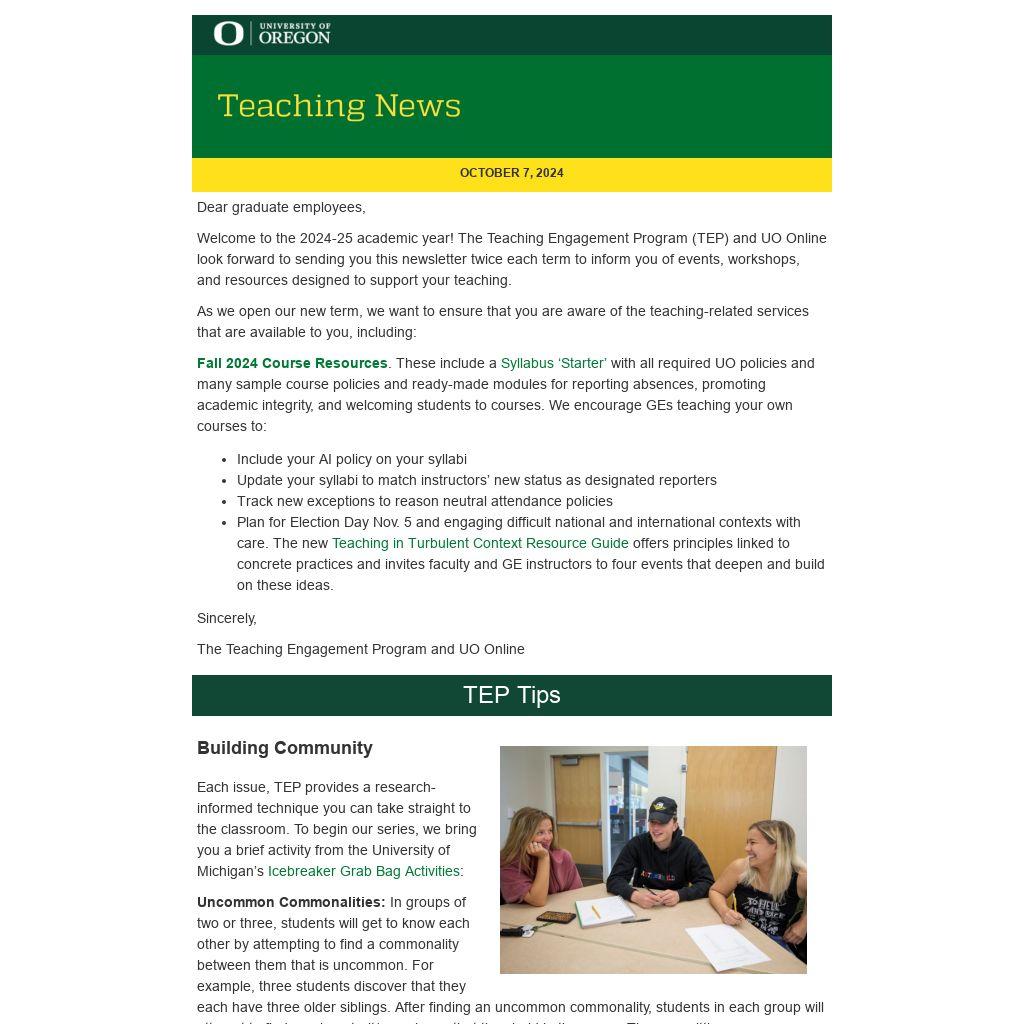 Welcome to the 2024-25 academic year! The Teaching Engagement Program (TEP) and UO Online look forward to sending you this newsletter twice each term to inform you of events, workshops, and resources designed to support your teaching.