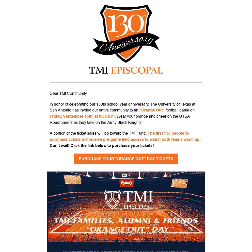 In honor of celebrating our 130th school year anniversary, The University of Texas at San Antonio has invited our entire community to an "Orange Out" football game on Friday, September 15th, at 6:00 p.m. Wear your orange and cheer on the UTSA Roadrunners as they take on the Army Black Knights!