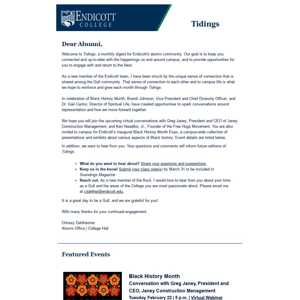 Welcome to Tidings, a monthly digest for Endicott's alumni community. Our goal is to keep you connected and up-to-date with the happenings on and around campus, and to provide opportunities for you to engage with and return to the Nest.